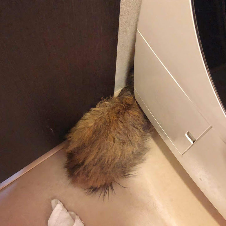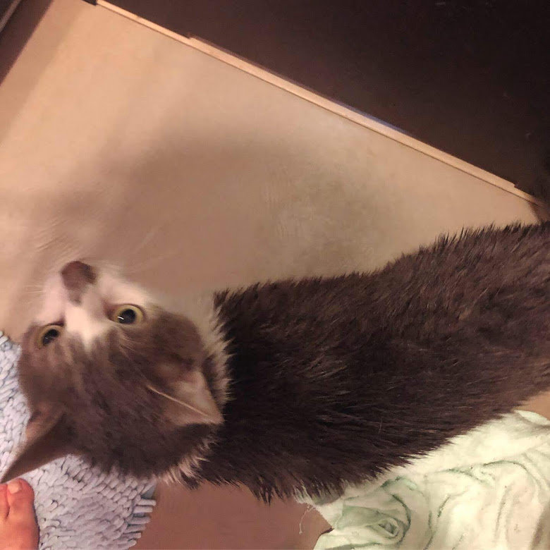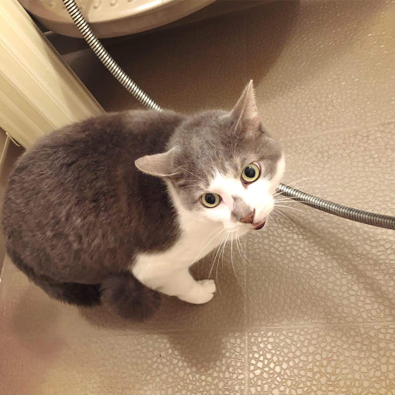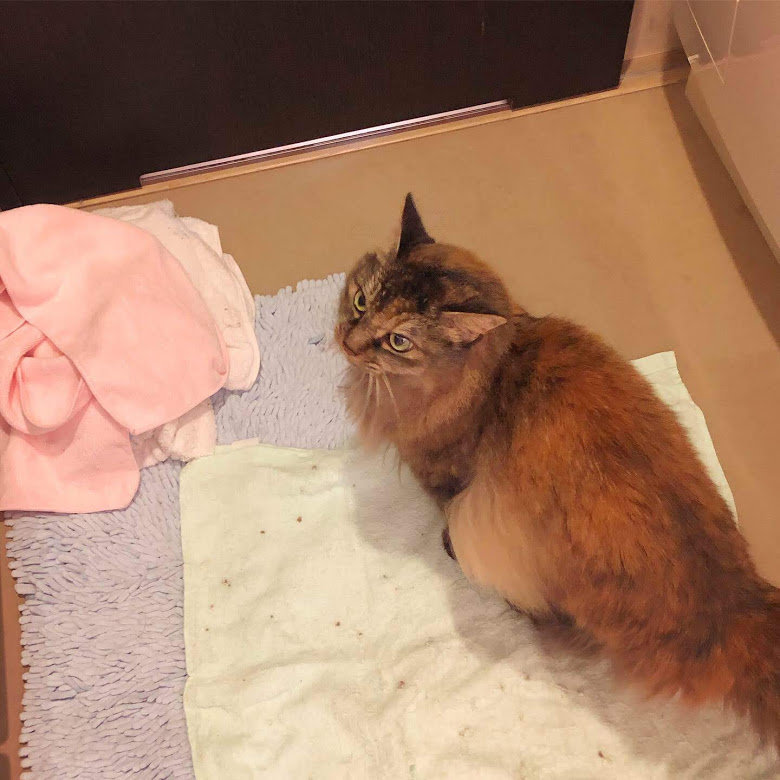 換気しながらとはいえ、かなりの湿度と気温の中で一人での猫洗い…なかなかにしんどいので一休みした後、次はおもちまるの番…!
