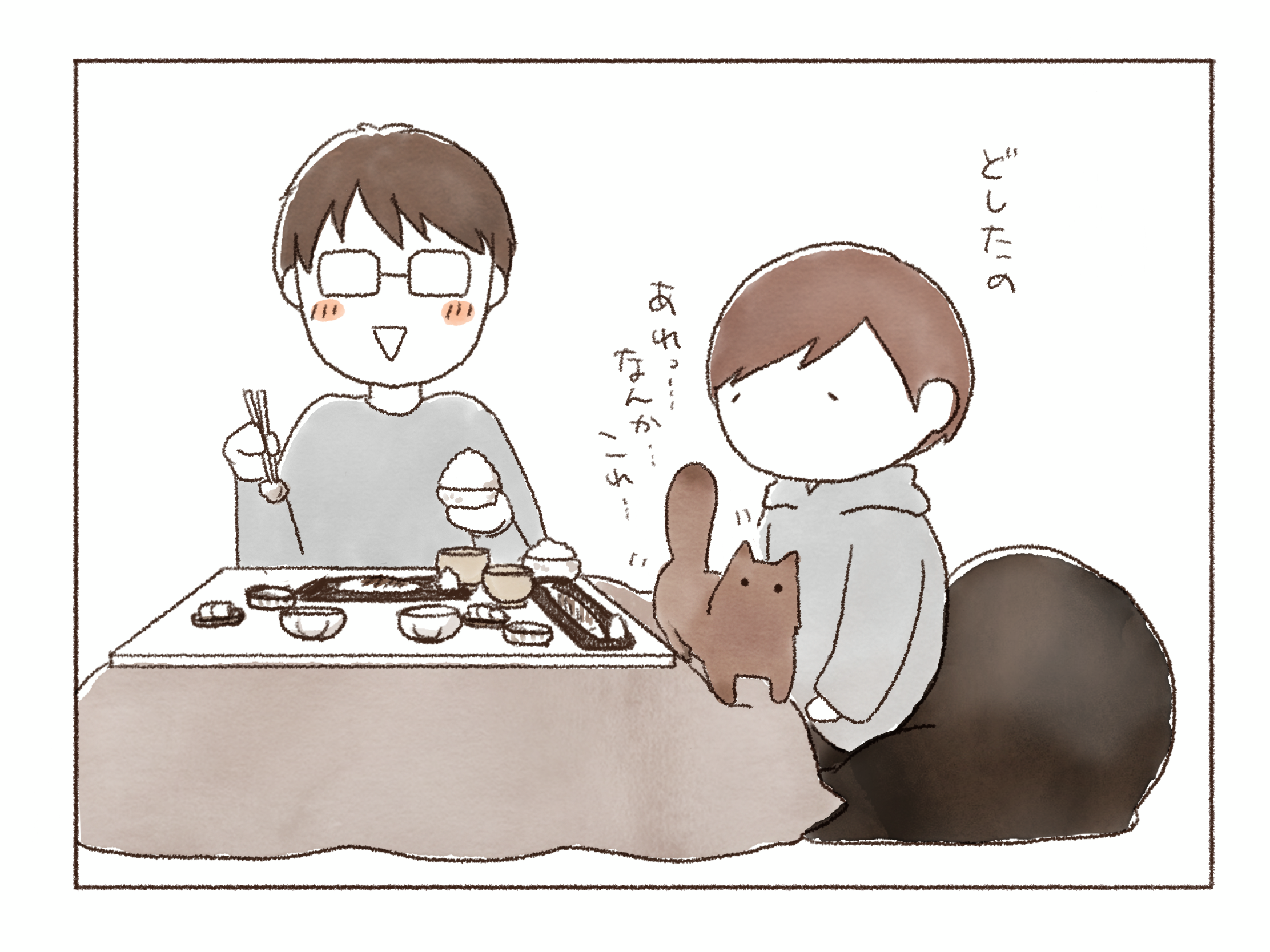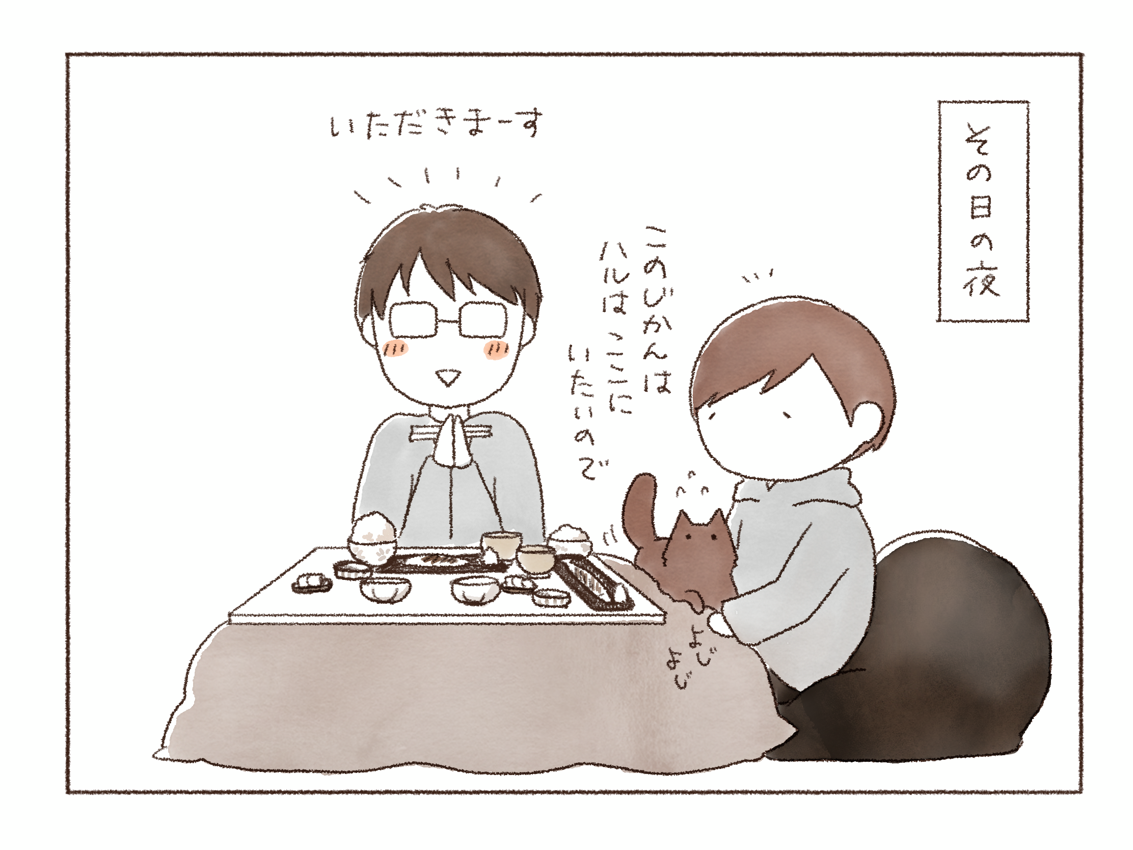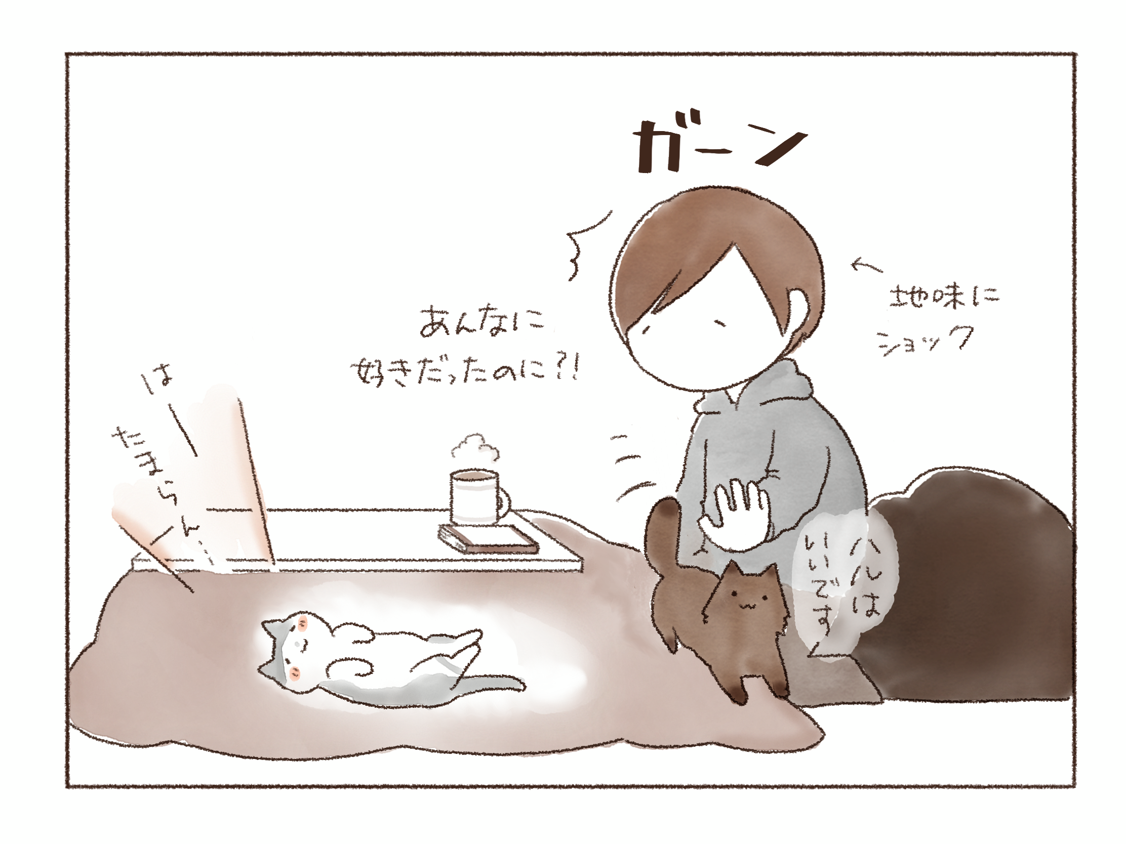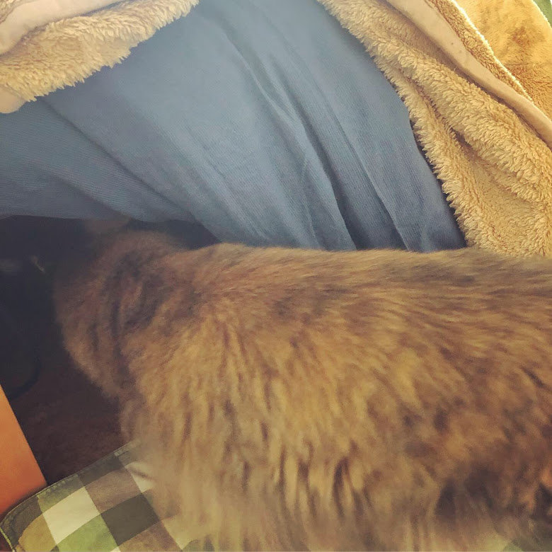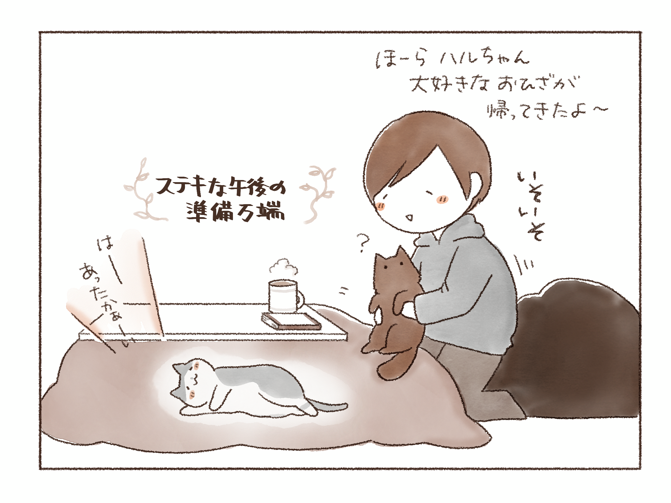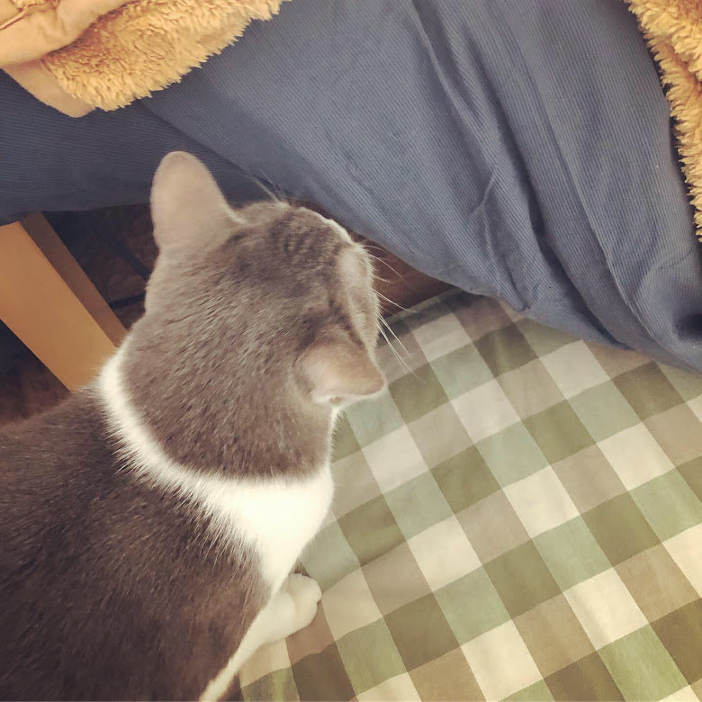 まだ温かくない事に気づくや否や、私で暖を取るオンちゃん。とにもかくにもあたたか~いコタツで一緒にゆっくり過ごそうじゃないか、君たち!といそいそ準備をします。