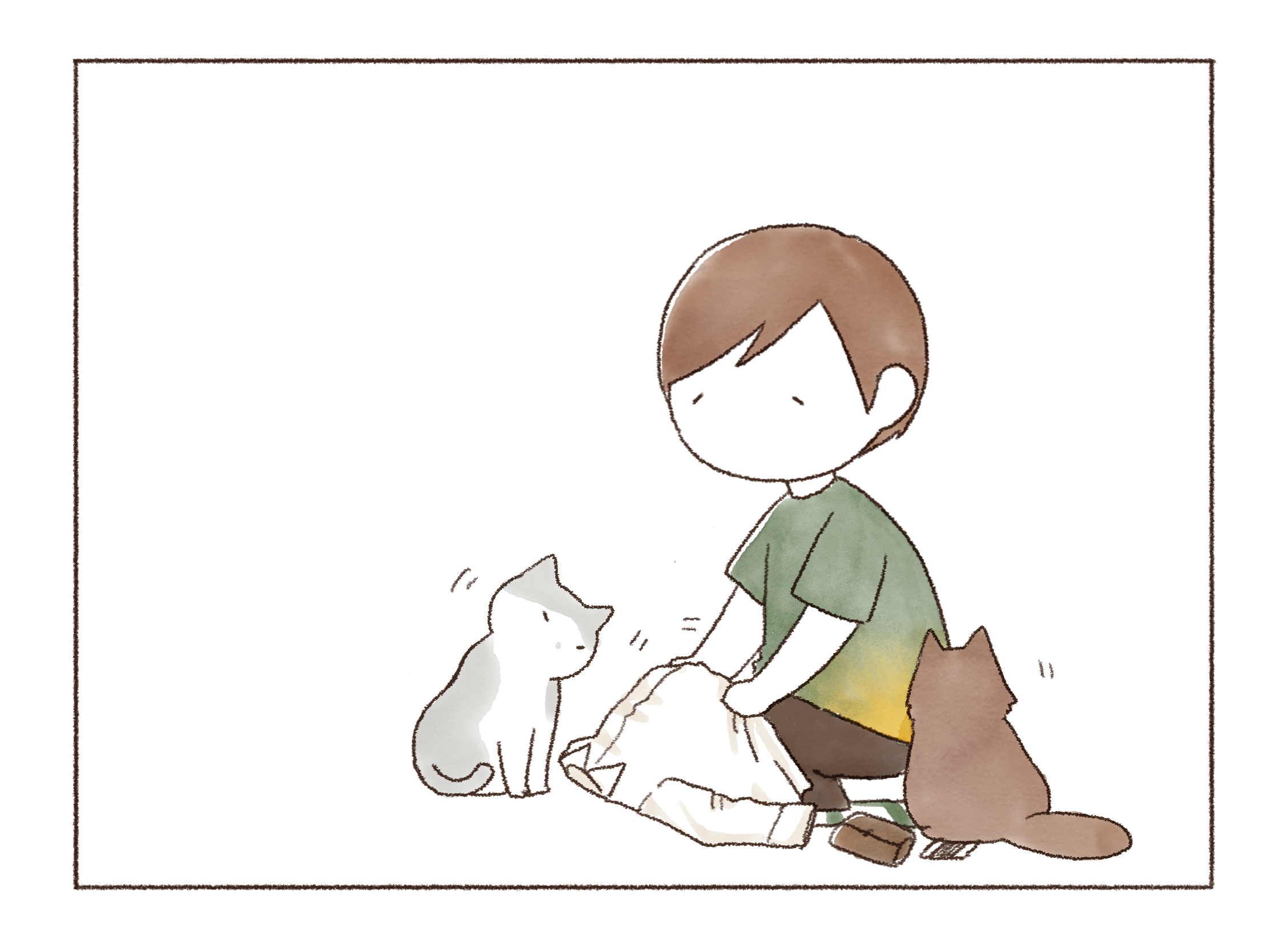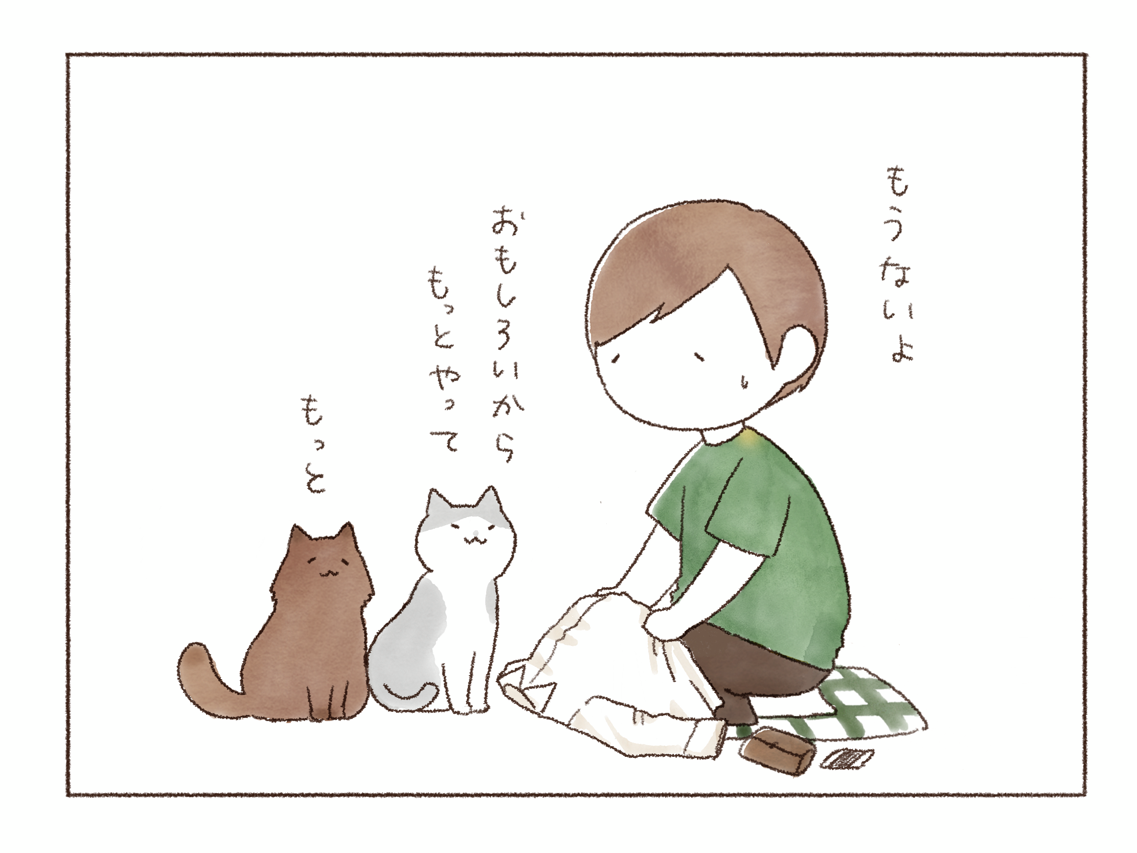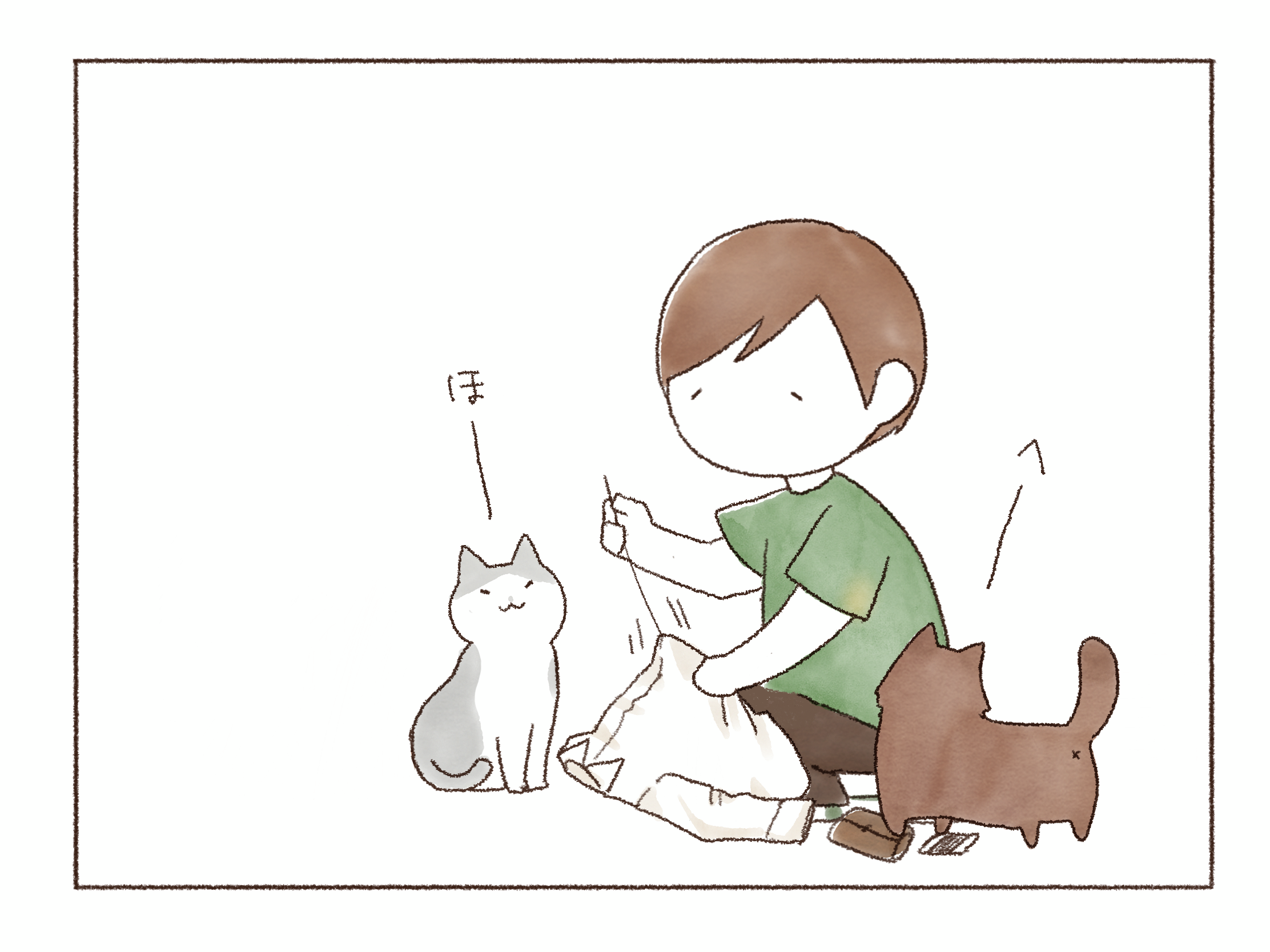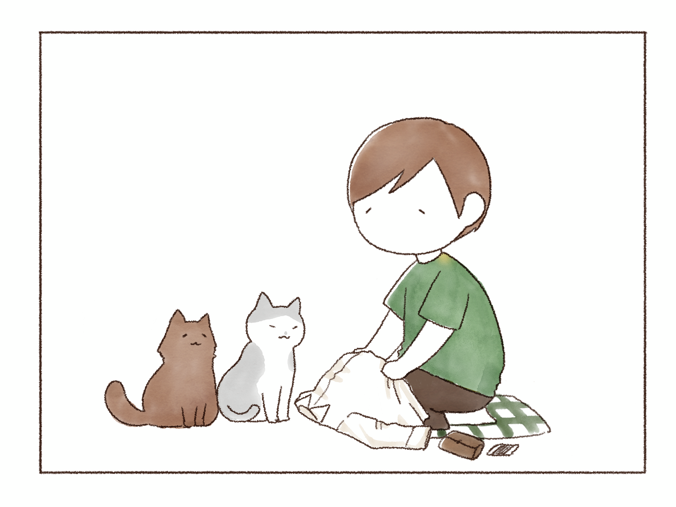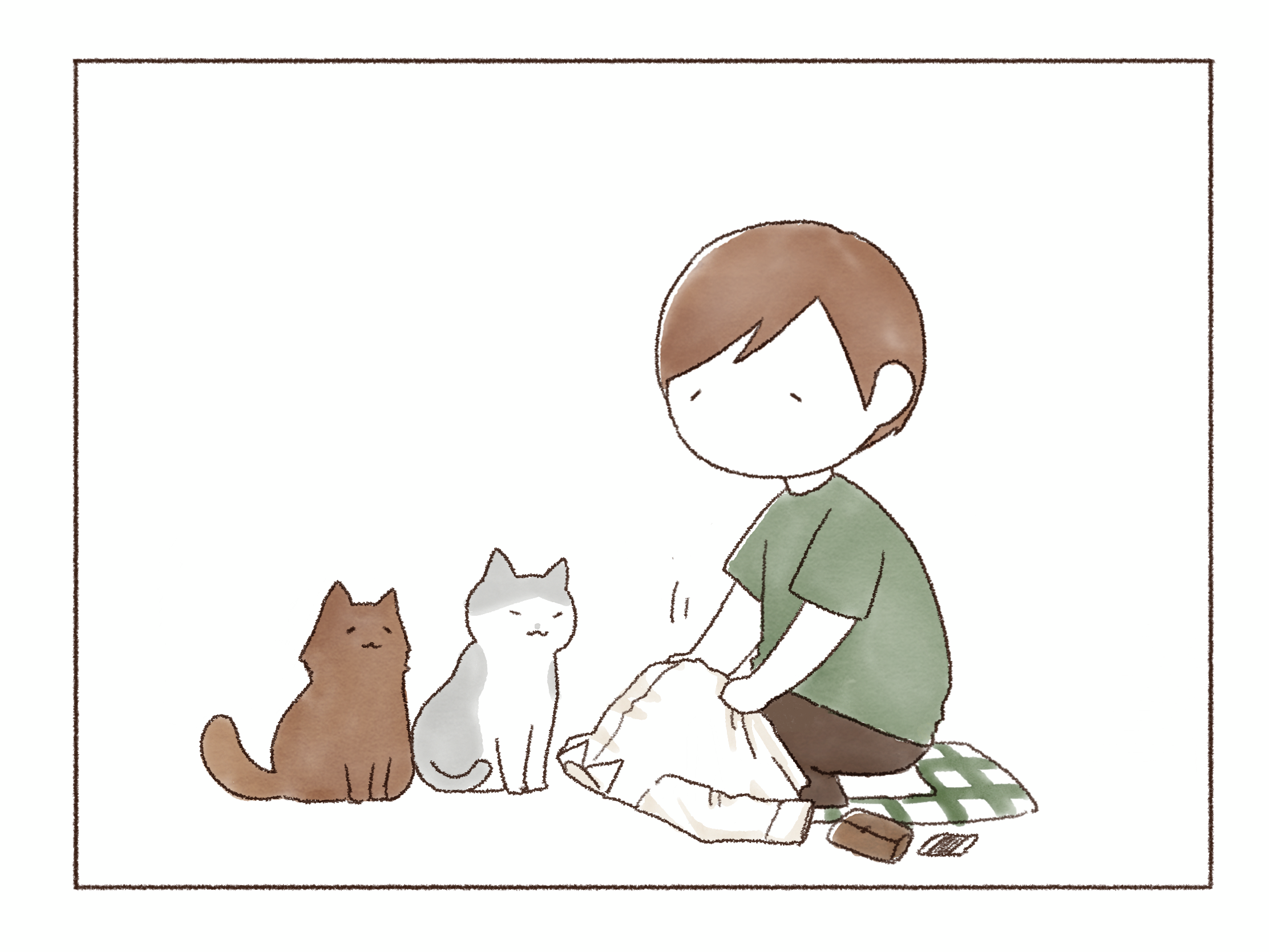 まだ温かくない事に気づくや否や、私で暖を取るオンちゃん。とにもかくにもあたたか~いコタツで一緒にゆっくり過ごそうじゃないか、君たち!といそいそ準備をします。