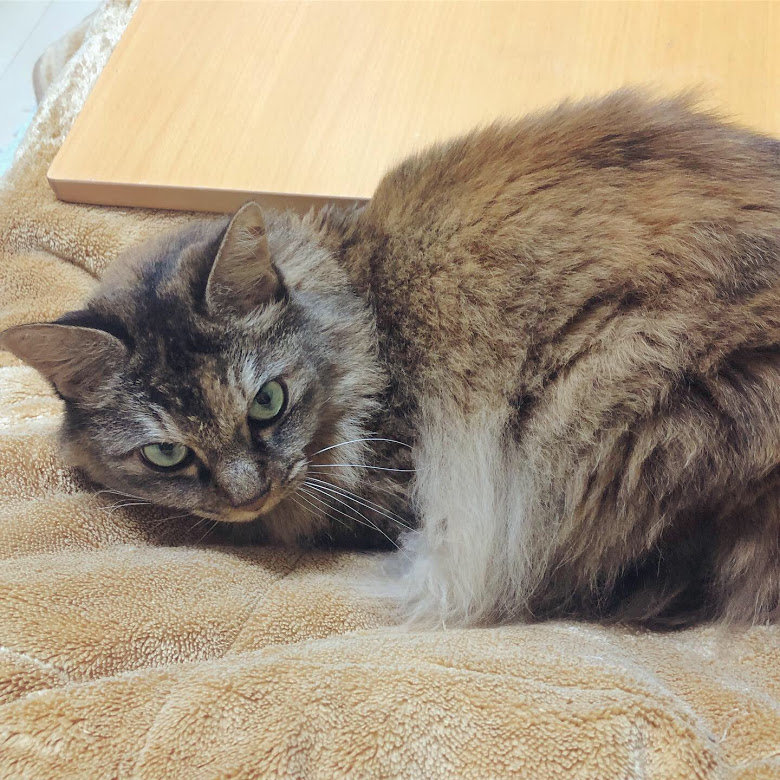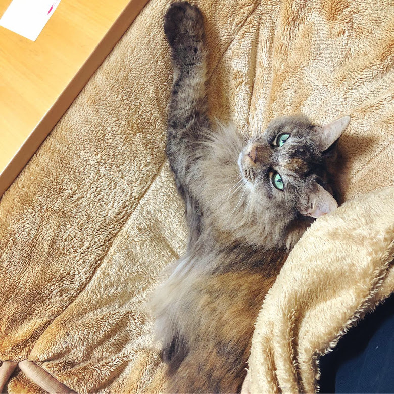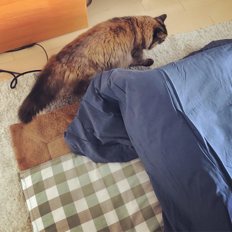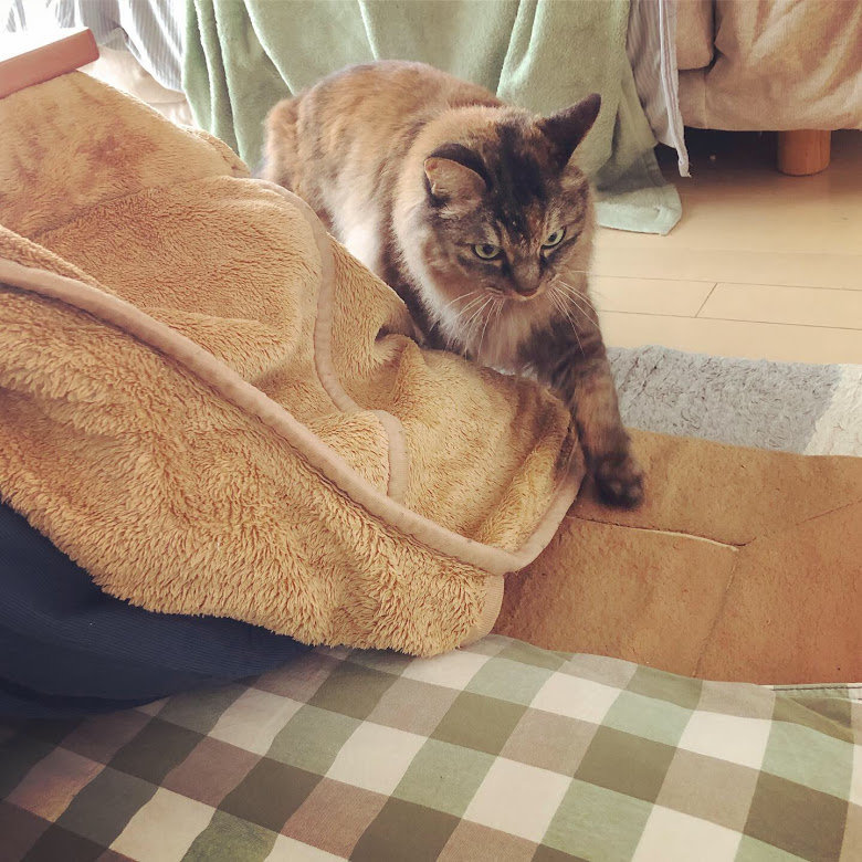 少し前に寒暖差で体調を崩し、慌ててコタツを出しました。毎年、時差が生じるハルちゃんですが(2017年時差はコチラ・2018年時差はコチラ)今年は珍しく起きているので、すぐにコタツに気づき大好きなおひざに喜んでくれるはず…!とウキウキ準備を始めたのですが…