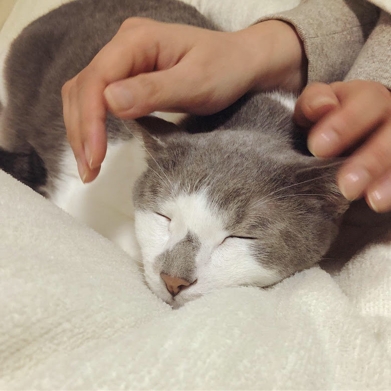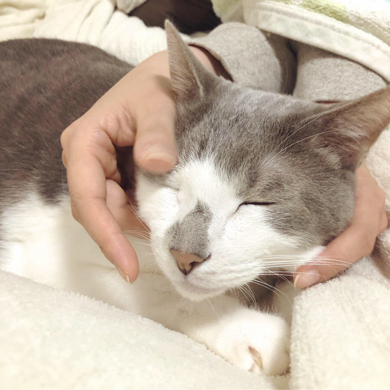 私が寝込んでいる一週間、朝から晩までずっとひっついていられたので甘えん坊度が増してしまったオンちゃん。撫でられてデレデレしているところを旦那さんに激写されました。