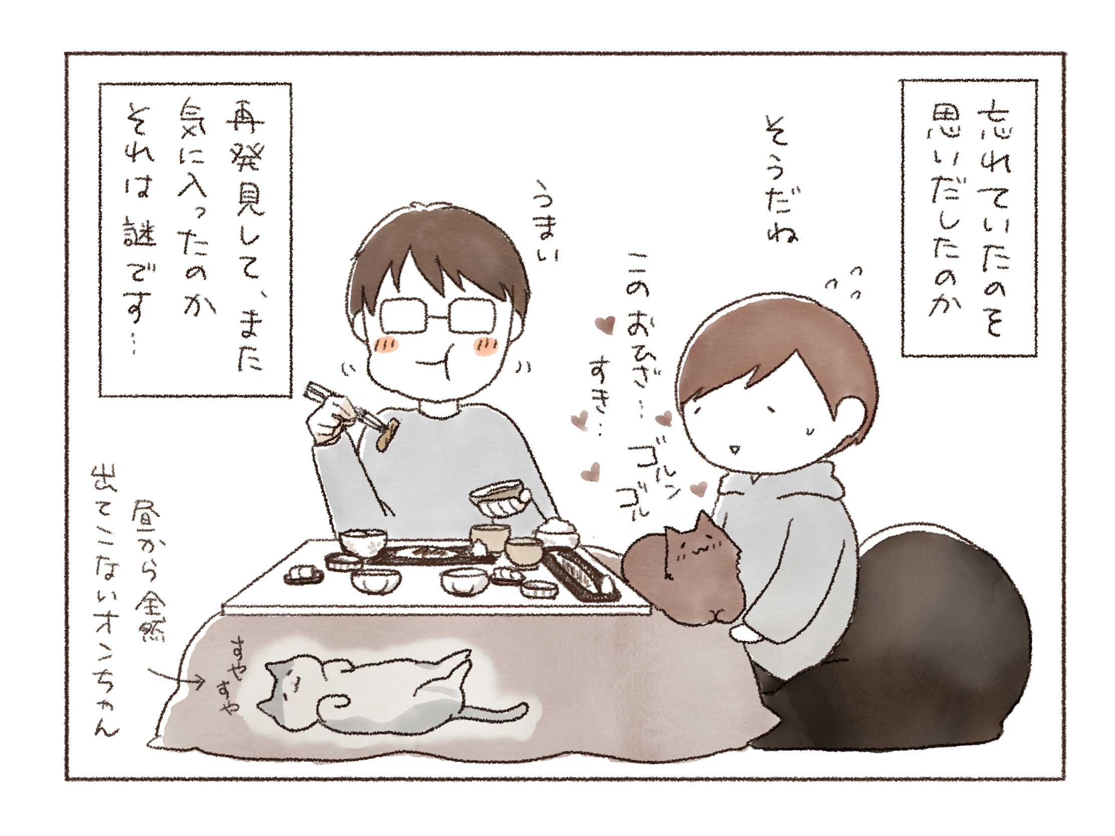 「ああ~またこのおひざにのれるなんて~」 ただひざに乗るだけでなく、この「コタツのおひざ」は格別ですごく嬉しいらしく、ものすごいゴルンゴルン喉を鳴らしています。