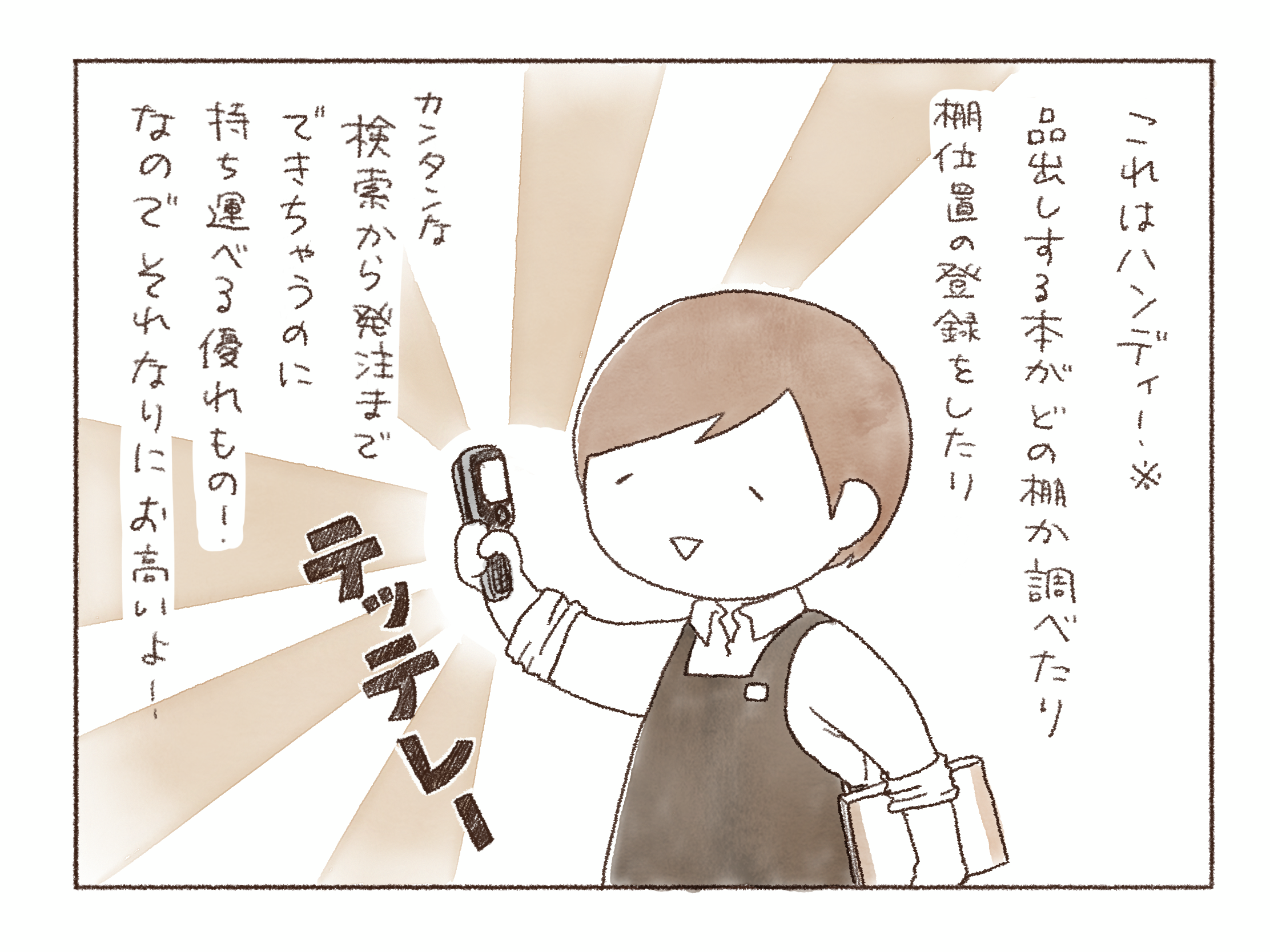 *正式名称は「ハンディターミナル」。店によって「ハンディ」「子機」など、呼ばれ方も性能も異なる。当然お高いほど性能も良い。これがあると、いちいちレジや事務所のパソコンに戻らずに作業できる文明の利器。たまに調子に乗ってめいいっぱい読み込んで、データが消えて絶望するので小まめな吸い上げ、バックアップが必須。