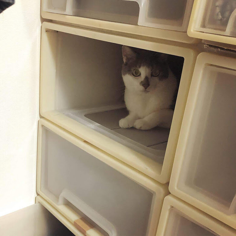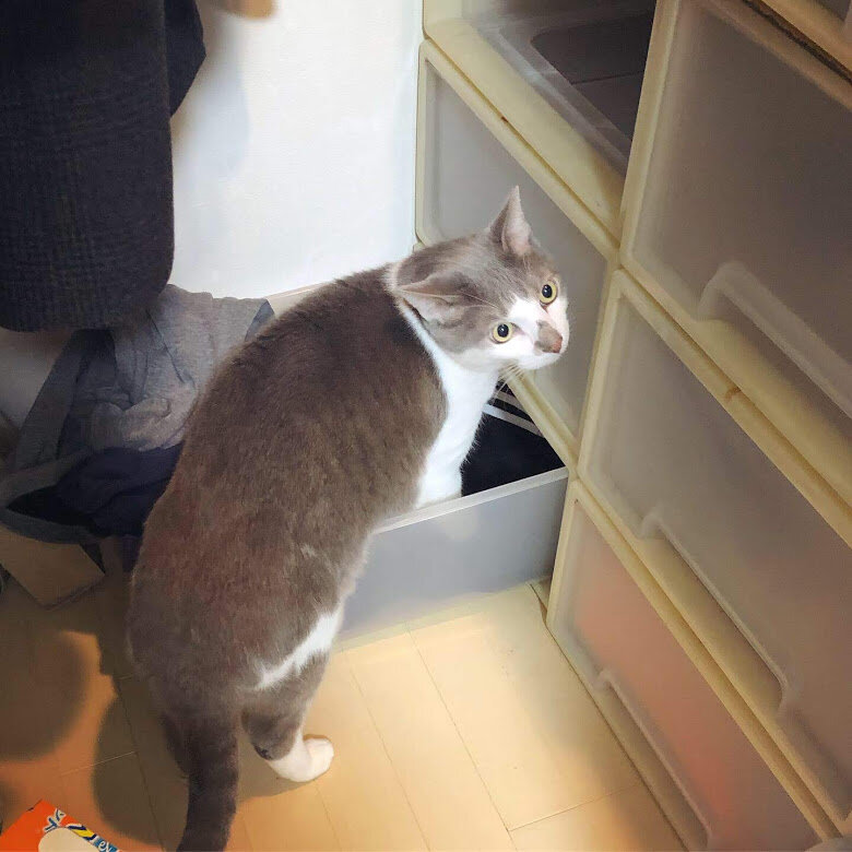 やっと整理できたので、引き出しを戻そうとしたら先に確認してくれるおもち。