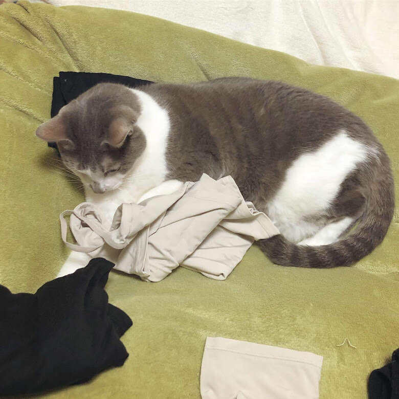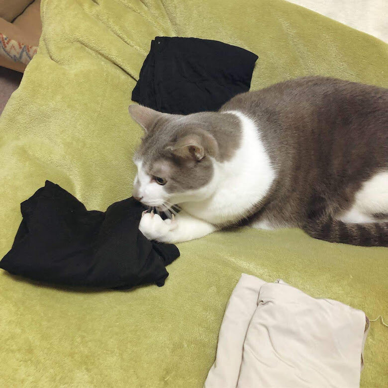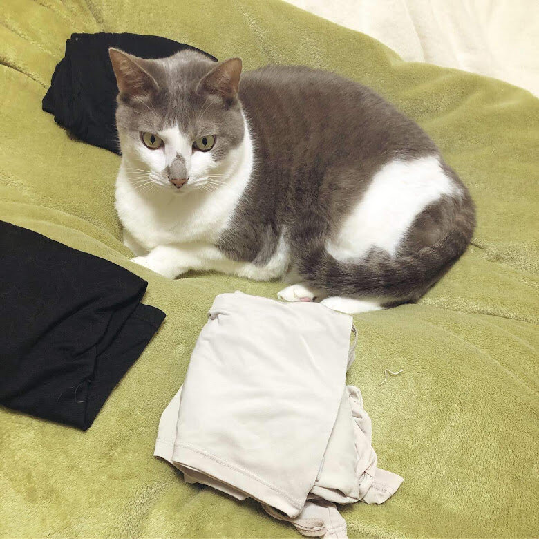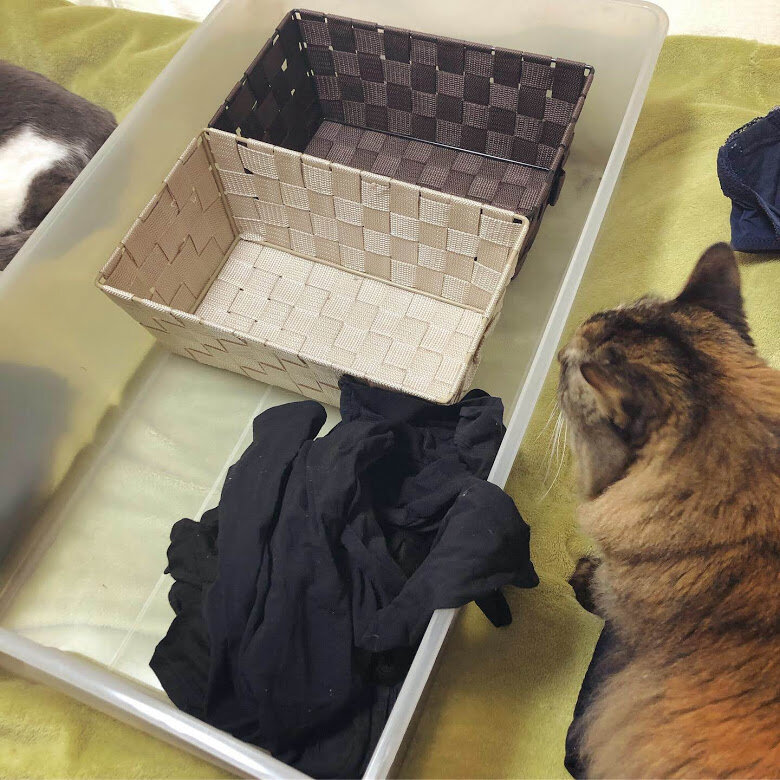 たたんでいるうちに、ヒートテックかエアリズムかわからなくなってきたので、メモを貼って整理していたら、貼るそばから剥がしまくるおもち。